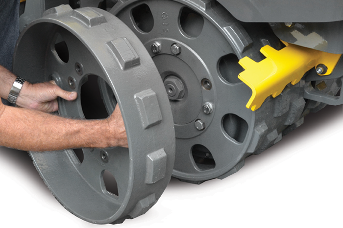 RTx-SC3 – two rollers in one: The attachment drums allow for an easy change between 82 and 56cm. The mounting points are near the hub, protected against heavy pollution and deformation. Scraper bars in two different widths and blind screws for locking the threaded holes with a narrow operating width are included in the standard package.